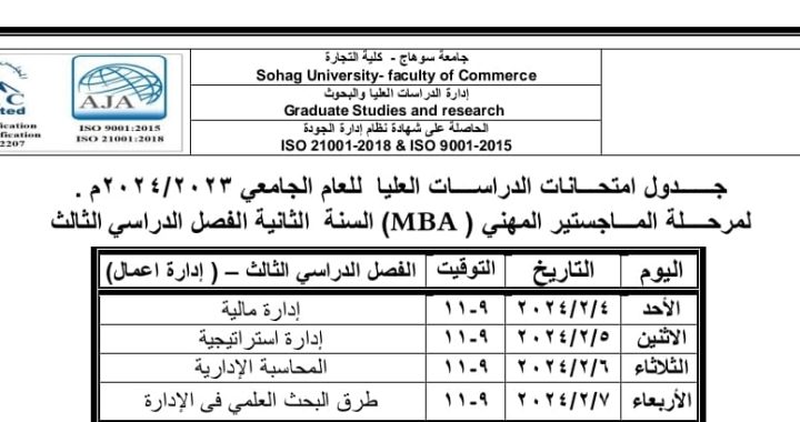 جدول امتحانات المستوي الثالث Posted on 4 يناير، 20244 يناير، 2024 by admin | لا توجد تعليقات جدول امتحانات المستوي الثالث